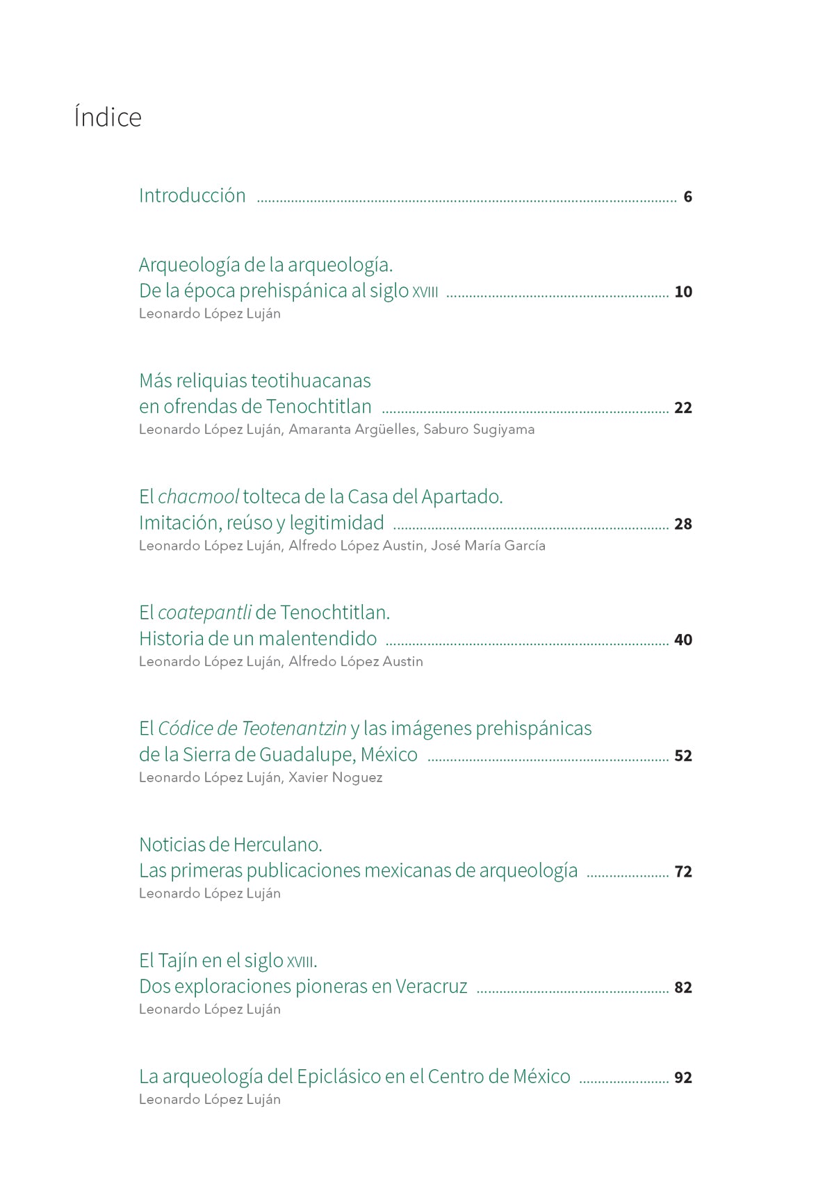 Los artículos que conforman esta antología –publicados originalmente en Arqueología Mexicana– tratan sobre la historia de la arqueología en México y todos se deben a la fecunda pluma de Leonardo López Luján, quien en varios textos aparece acompañado de distinguidos colegas. Lo primero por lo que es de destacarse esta recopilación es por su tema. El estudio de la historia de una disciplina científica es un asunto fundamental para entender su situación actual y, en cierto sentido, para vislumbrar futuras directrices, y la arqueología no es la excepción. Aun así, es un asunto que, con notables excepciones, en México no ha recibido la atención que se merece.