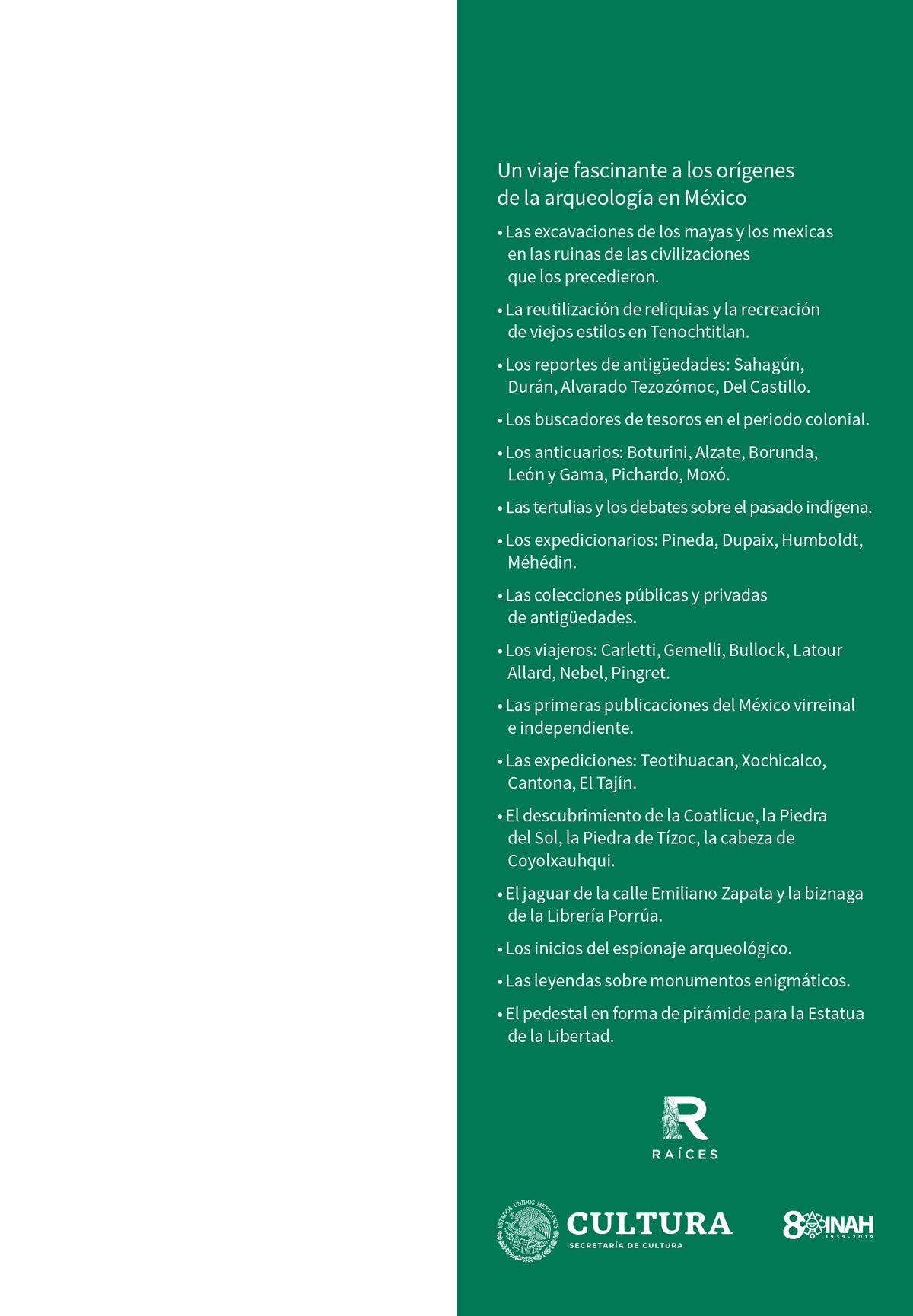 Por las páginas de este libro, el lector verá transitar, entre otros, a arqueólogos, anticuarios, viajeros, museógrafos y hasta espías, en un periplo fascinante que nos va revelando la historia de varios de los sitios y objetos más notorios de nuestro pasado prehispánico, así como de otros tantos menos conocidos, pero igualmente importantes. Bellamente ilustrado con grabados, fotos, mapas y dibujos, la lectura de este libro es un gran gozo para el lector.