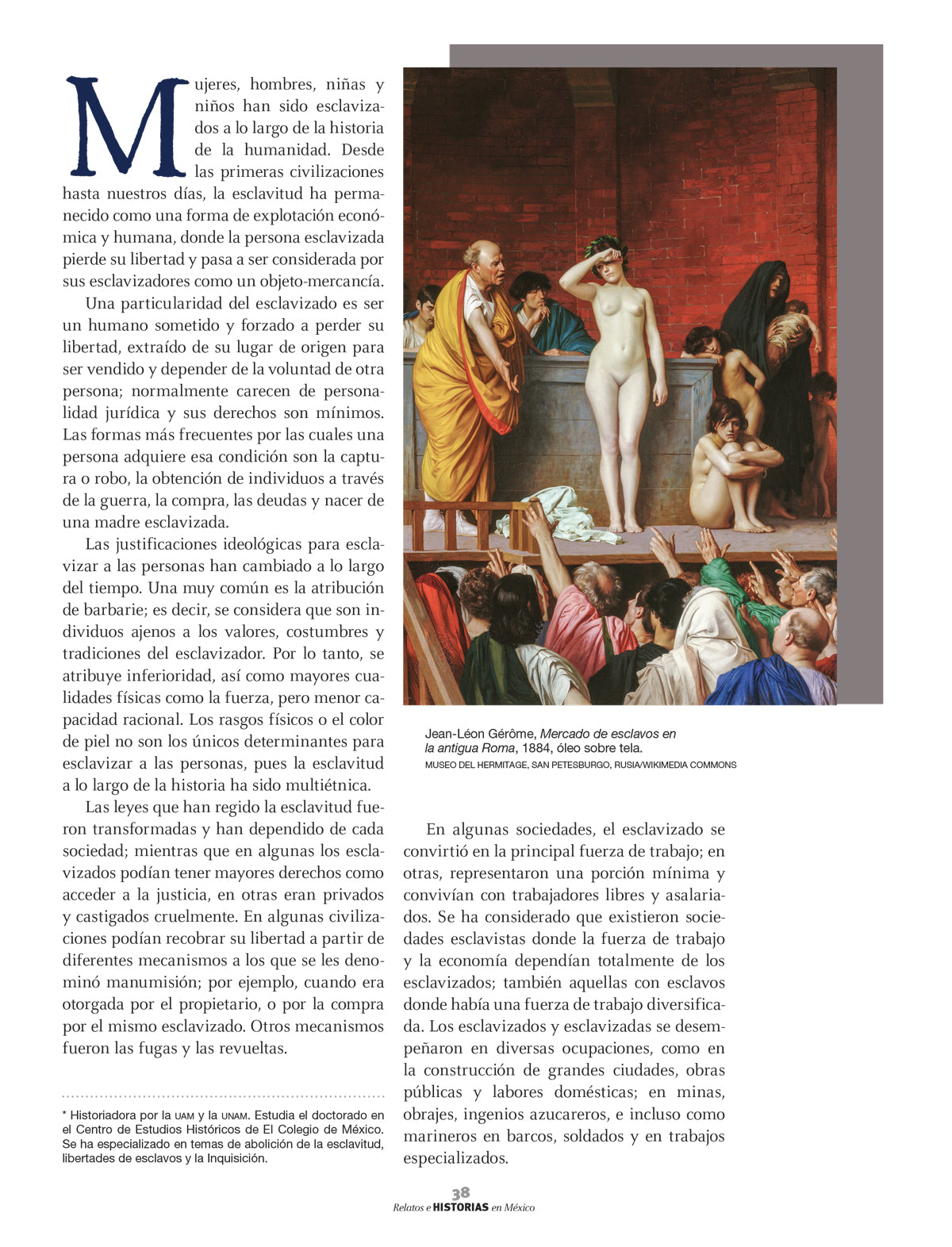 La esclavitud es una realidad histórica que va desde la Antigüedad hasta el presente siglo. Mujeres, hombres, niñas y niños han sido esclavizados a lo largo de la historia de la humanidad. Desde las primeras civilizaciones hasta nuestros días, la esclavitud ha permanecido como una forma de explotación económica y humana, donde la persona pierde su libertad y pasa a ser considerada como un objeto-mercancía. La forma de sujeción y explotación de los seres humanos se ha ido modificando con el tiempo, adaptándose a las nuevas concepciones y leyes, aunque sigue hasta nuestros días.