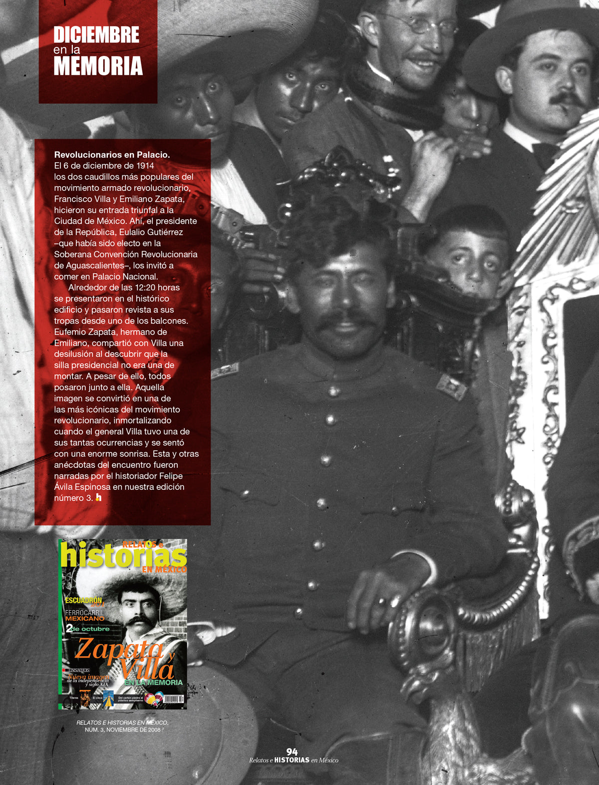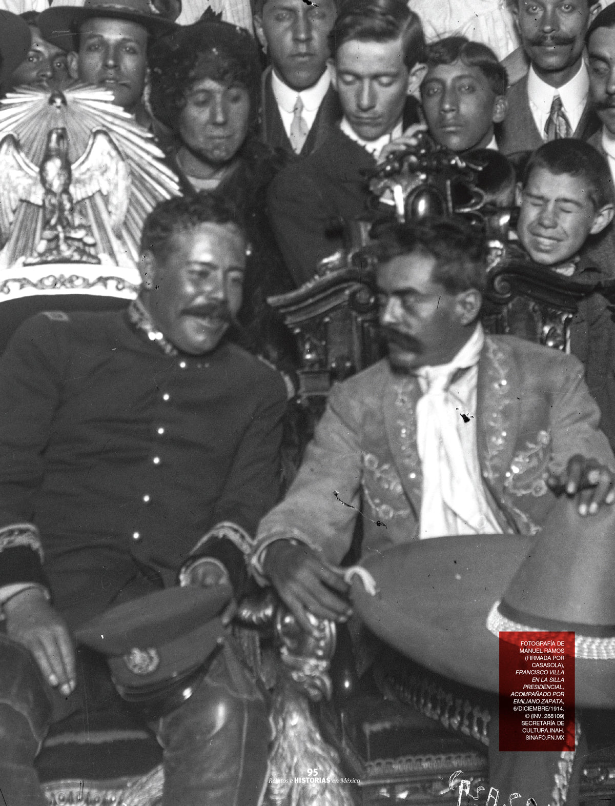 El 6 de diciembre de 1914 los dos caudillos más populares del movimiento armado revolucionario, Francisco Villa y Emiliano Zapata, hicieron su entrada triunfal a la Ciudad de México. Ahí, el presidente de la República Eulalio Gutiérrez los invitó a comer en Palacio Nacional. Alrededor de las 12:20 horas se presentaron en el histórico edificio y pasaron revista a sus tropas desde uno de los balcones. Eufemio Zapata, hermano de Emiliano, compartió con Villa una desilusión al descubrir que la silla presidencial no era una de montar. A pesar de ello, todos posaron junto a ella.