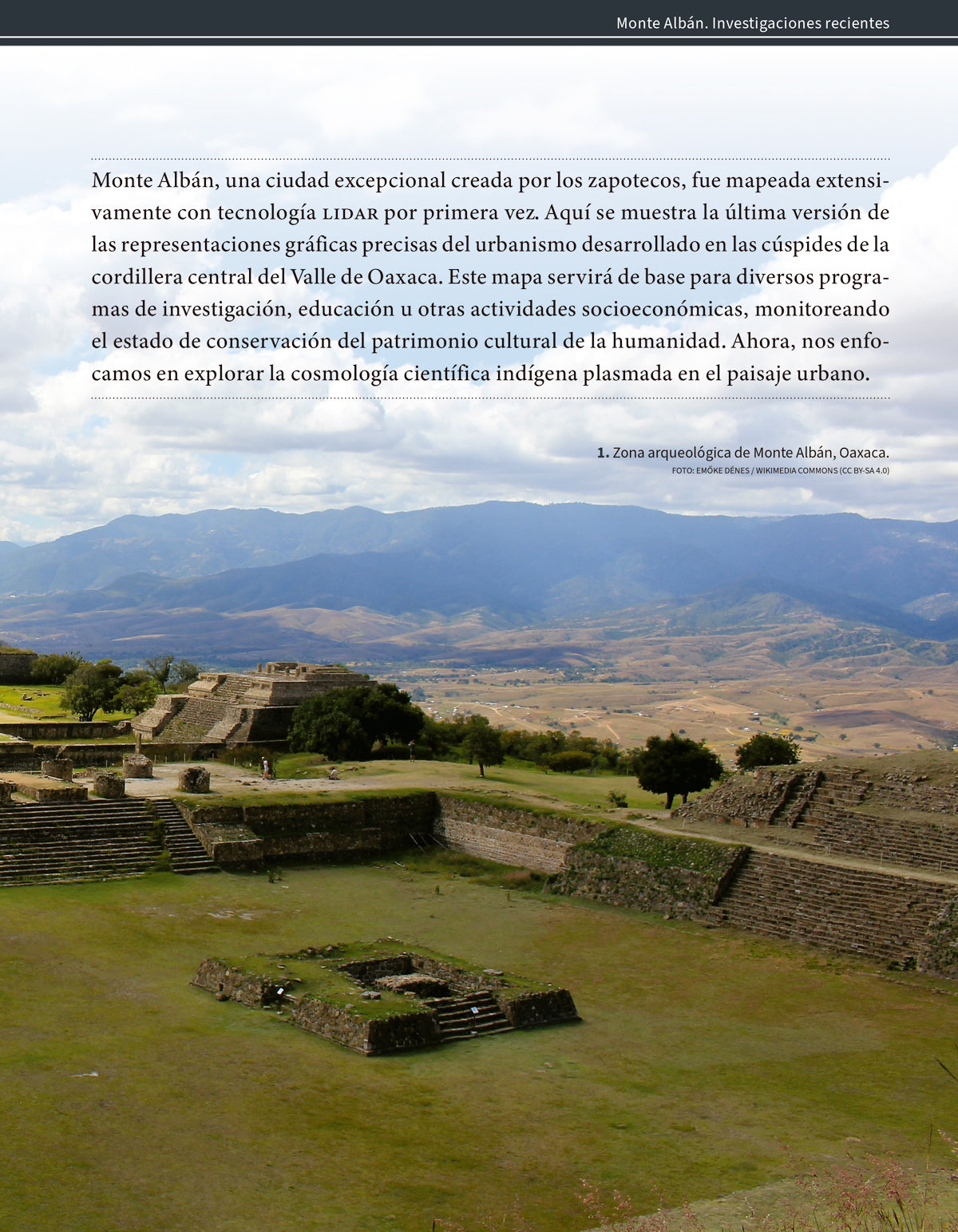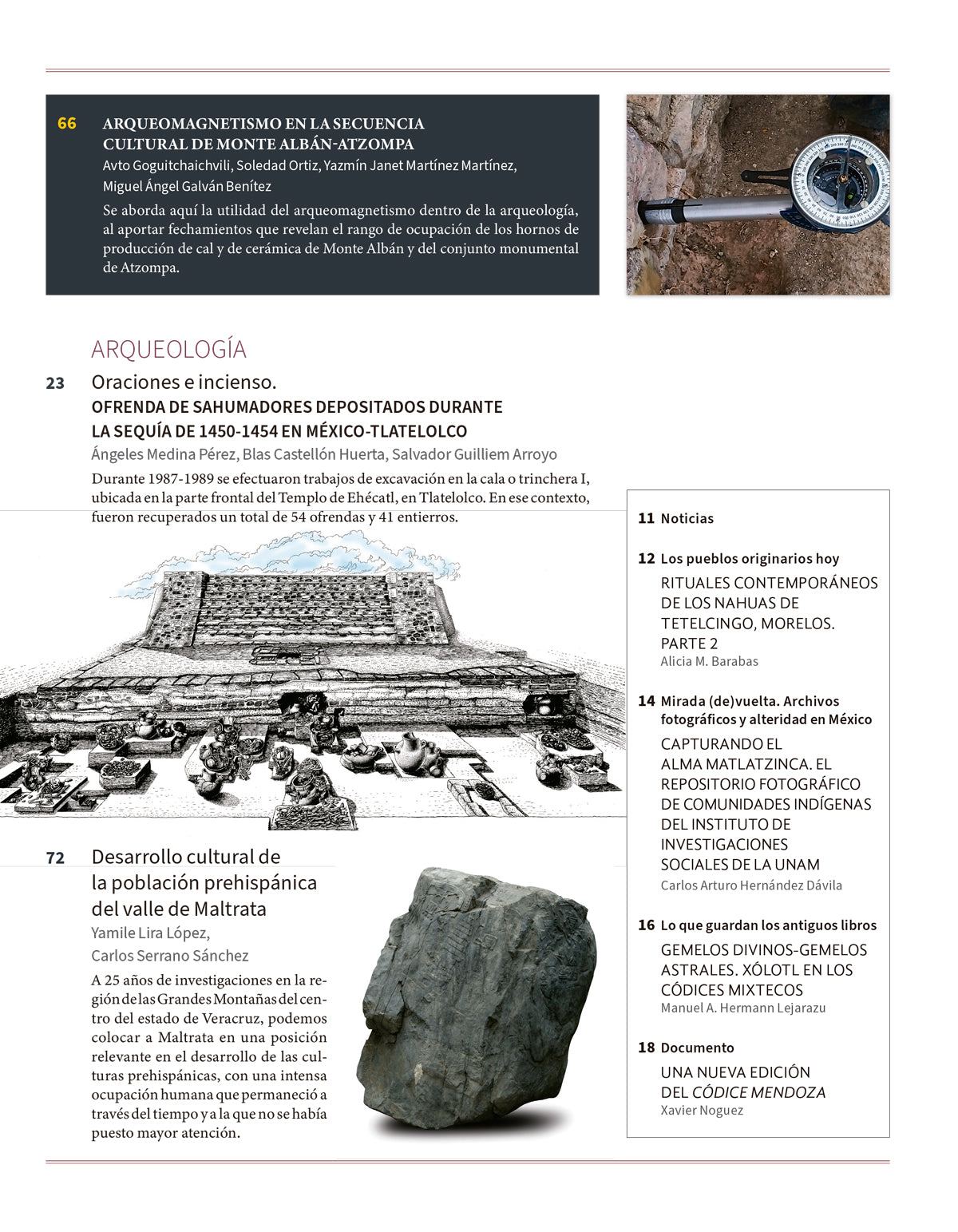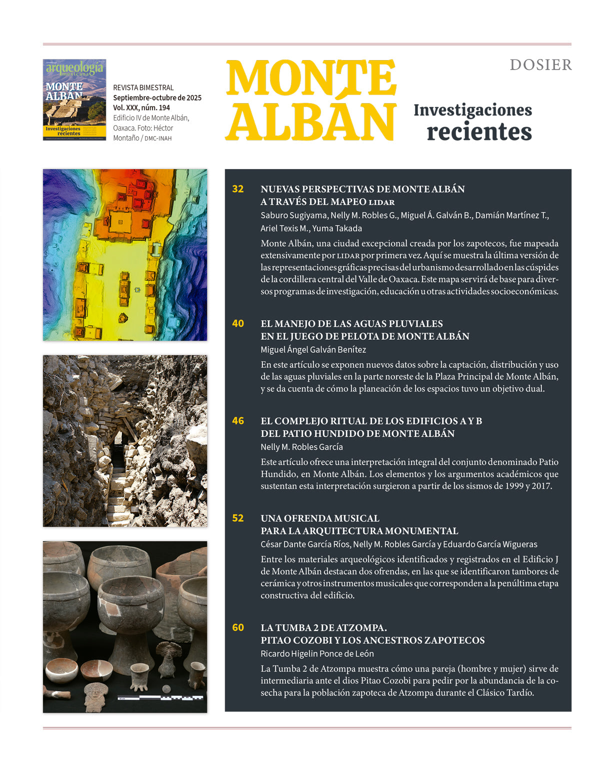 Se abordan en este número estudios recientes sobre Monte Albán –y Atzompa en menor medida–, entre ellos el primer mapa de Monte Albán hecho mediante tecnología LIDAR; distribución y uso de las aguas pluviales en la parte noreste de la Plaza Principal de Monte Albán; una interpretación integral del conjunto denominado Patio Hundido, en Monte Albán; dos ofrendas localizada en en el Edificio J de Monte Albán; la Tumba 2 de Atzompa y su relación con el dios Pitao Cozobi, y los hornos de producción de cal y de cerámica de Monte Albán y del conjunto monumental de Atzompa.