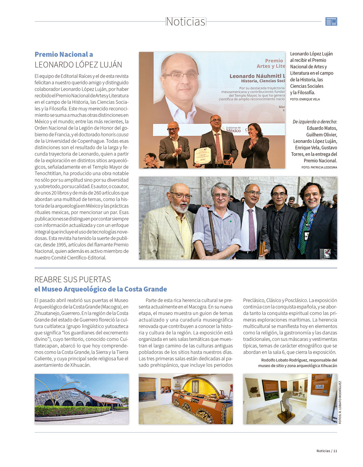 El equipo de Editorial Raíces y el de esta revista felicitan a nuestro querido amigo y distinguido colaborador Leonardo López Luján por haber recibido el Premio Nacional de Artes y Literatura en el campo de la Historia, las Ciencias Sociales y la Filosofía.
