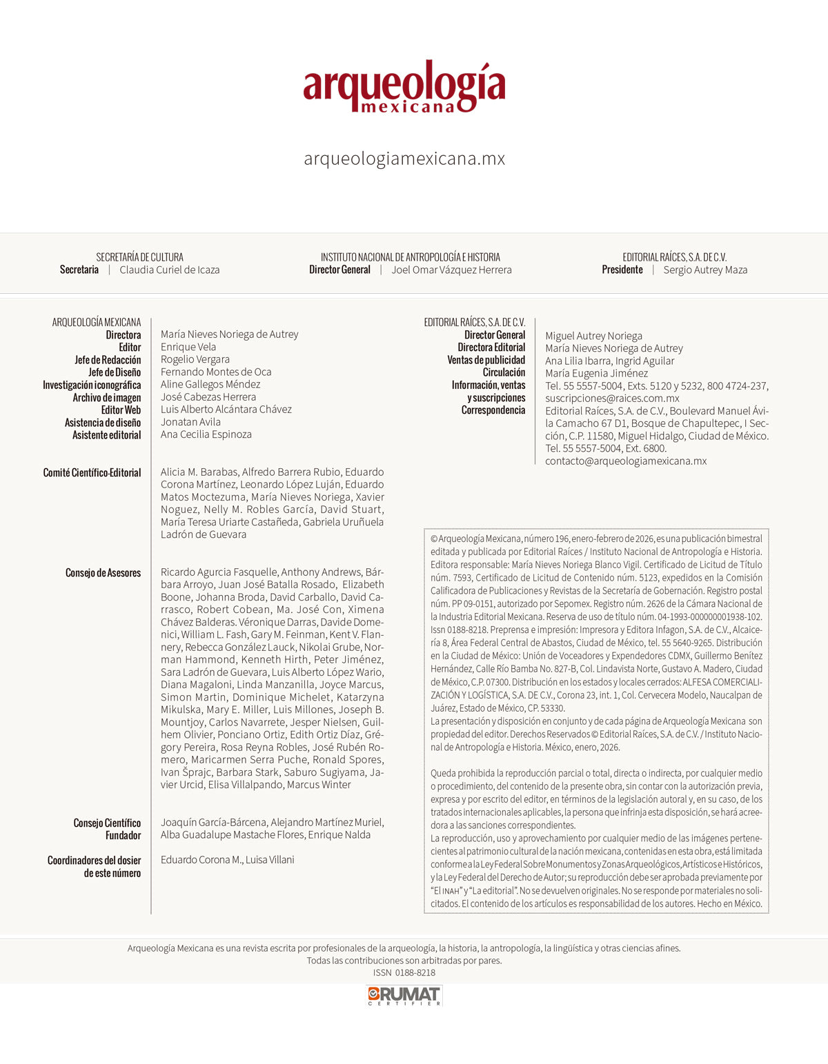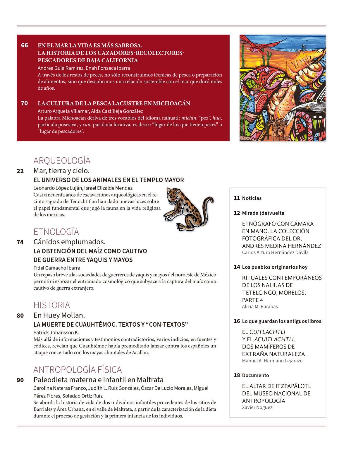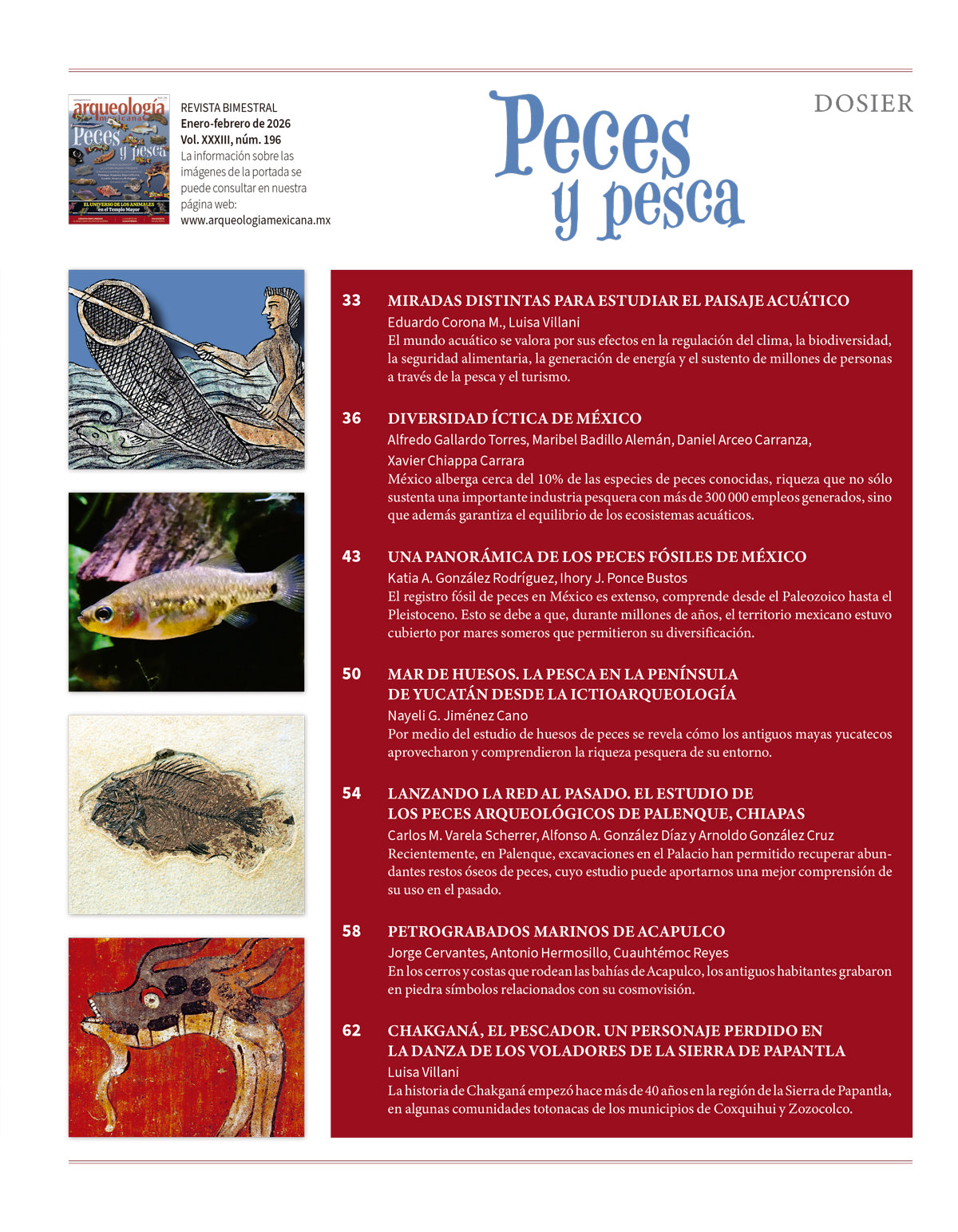 El mundo acuático es fundamental para la vida en la Tierra al cumplir diversas funciones: es un regulador climático, productor de oxígeno y alimento, y un sustento para la economía y la sociedad desde la antigüedad hasta el presente. México es un país rico en diversidad biológica y cultural, de hecho, aunque se nos olvida, está considerado entre una decena de países del planeta que se denominan megadiversos. En el mundo acuático tenemos registrada parte de esa diversidad y no hemos alcanzado a contarla toda. En el pasado remoto, el agua permitió la evolución de diversas formas de vida, desde microorganismos hasta grandes plantas y animales; ahora los estudios paleontológicos nos muestran que el territorio del actual México fue una región donde se dio una gran diversificación de peces y animales marinos. Ese mundo complejo, diverso en lo natural y lo cultural, fue lo que motivó a convocar a una serie de especialistas para que nos mostraran una visión caleidoscópica del mundo acuático. Así, se abordan en este número temas como la diversidad de peces en México y el extenso registro de peces fósiles, y estudios sobre regiones específicas, entre ellas la península de Yucatán, Palenque (Chiapas), Acapulco y la pesca en Baja California y Michoacán. Además de un acercamiento al personaje conocido como Chakganá, el Pescador, relacionado con la Danza de los Voladores de la Sierra de Papantla.
