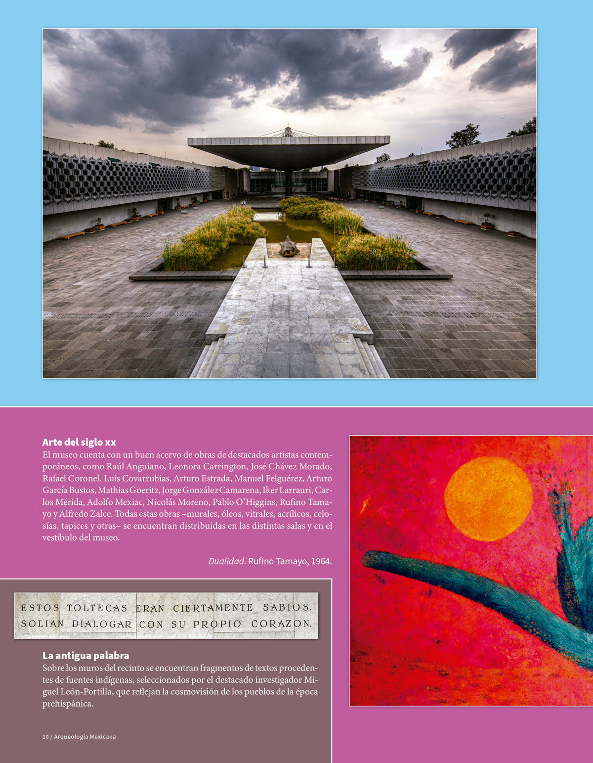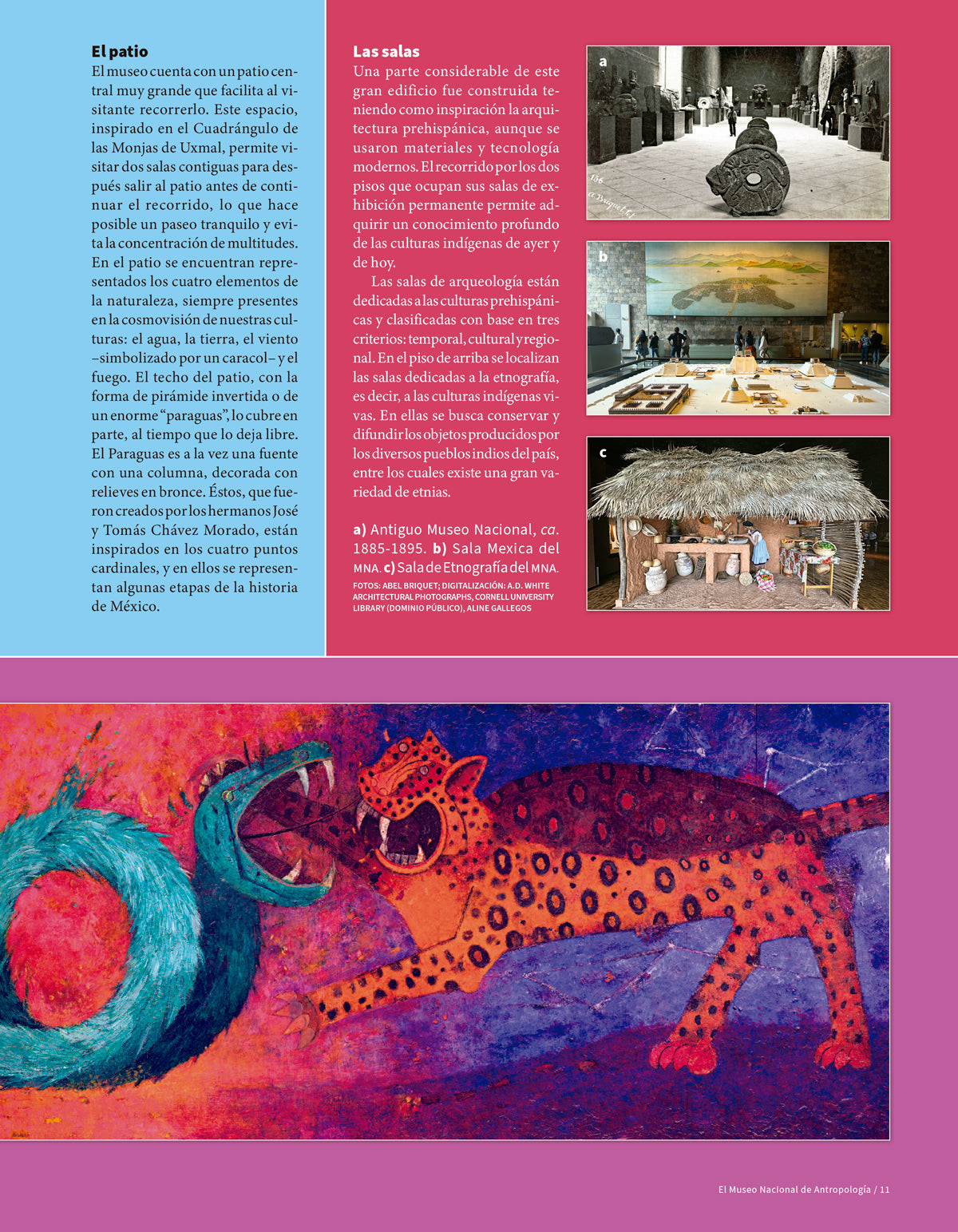 Las colecciones etnográficas y arqueológicas del Museo Nacional de Antropología se encuentran entre las más ricas y significativas del mundo. Esas colecciones han sido conformadas a lo largo de los dos siglos de existencia del recinto. Entre los primeros objetos que pasaron a formar parte de su acervo se encuentran los grandes monolitos mexicas –la Gran Coatlicue, la Piedra de Tízoc y la Piedra del Sol–, localizados a fines del siglo XVIII durante las obras de remodelación de la Plaza Mayor de la ciudad de México. A partir de entonces sus colecciones fueron aumentando gradualmente a través de donaciones, adquisiciones y, principalmente, hallazgos derivados de las investigaciones arqueológicas. El Museo Nacional de Antropología fue inaugurado el 17 de septiembre de 1964. Su planeación y construcción se concretó en tan sólo 19 meses, de febrero de 1963 a septiembre de 1964. En el proyecto participaron arquitectos, ingenieros, antropólogos, historiadores, museógrafos, artistas y educadores. Una parte considerable de este gran edificio fue construida teniendo como inspiración la arquitectura prehispánica, aunque se usaron materiales y tecnología modernos. El recorrido por los dos pisos que ocupan sus salas de exhibición permanente permite adquirir un conocimiento profundo de las culturas indígenas de ayer y de hoy. Las salas de arqueología (de las que nos ocupamos en este especial) están dedicadas a las culturas prehispánicas y clasificadas con base en tres criterios: temporal, cultural y regional. En el piso de arriba se localizan las salas dedicadas a la etnografía, es decir, a las culturas indígenas vivas.